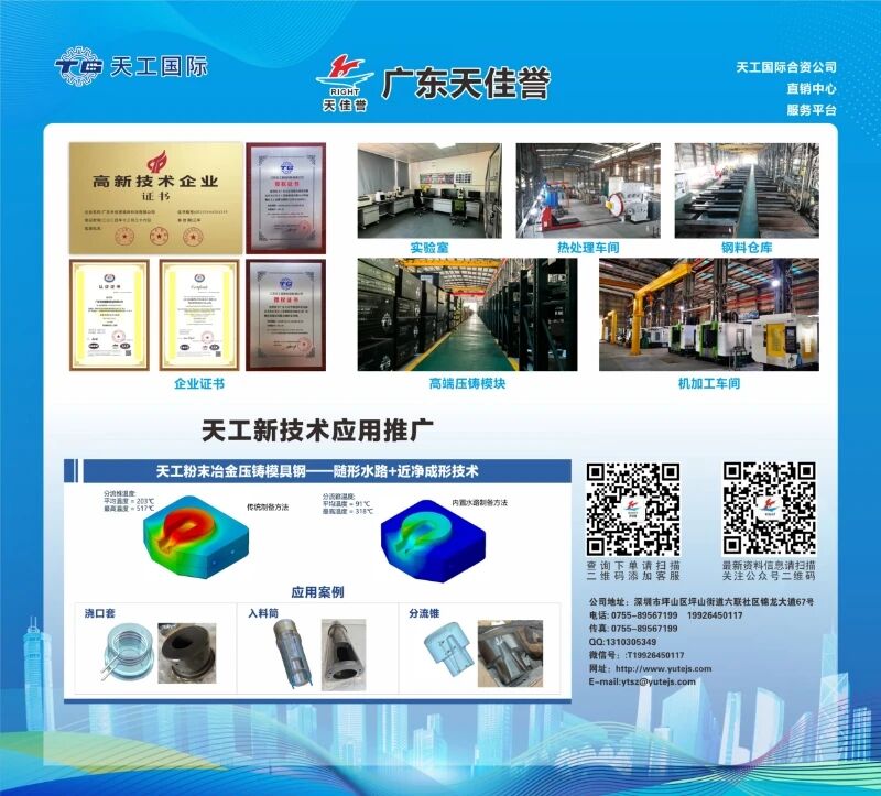 2025年由天工国际牵头,联合清华大学、宁德时代等八家单位共同参与国家重点研发项目-“新型压铸模具用钢粉末冶金与增材制造关键技术研发与应用”,其中“天工粉末冶金压铸模具钢-近净成型+随形冷却技术”是该项目的重点内容之一。天佳誉作为天工国际的市场前沿肩负起了该技术在广东地区的推广应用。 在压铸生产中,料筒负责储存、加热并输送金属熔液;浇口套、分流锥作为料筒与模具的连接接口,引导熔液高效进入模具;分流锥实现熔液的均匀分流,避免涡流产生;冲头则推动熔液完成注射填充;模具实现金属液成型,通过模具的密封和导向,让高温金属液在压力下充满型腔并冷却凝固。这些部件及模具系压铸机浇注系统的关键组成部分,其质量直接关系到金属熔液的输送稳定性、填充均匀性与成型效率,进而影响压铸件的尺寸精度、内部致密度与表面质量。 广东天佳誉模具科技有限公司(简称“广东天佳誉”)总经理邓志斌表示:“作为压铸机的主要损耗品,这些部件长期接触高温高压的金属熔液,会受到腐蚀、冲刷和热疲劳作用等因素影响,进而影响生产效率和使用寿命。不过,通过“天工粉末冶金压铸模具钢-近净成型+随形冷却技术”的运用,不仅能提高产品性能,还能大幅提高水路冷却效果,实现高效生产,降低能耗,提升生产价值。” 近日,“2025国际(深圳)铸业展”在深圳国际会展中心成功举办。广东天佳誉凭借其创新新技术产品“天工粉末冶金压铸模具钢-近净成形+随形冷却技术”成为展会焦点之一。该技术突破了传统工艺局限,为压铸机及模具配件耗材提供了全新制造解决方案。