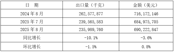 其中:8月份出口119.9万吨,同比增长10.2%,环比增长9.1%,对美国出口1.6万吨,同比下降27.9%,环比下降17.5%,见表2-表5。
