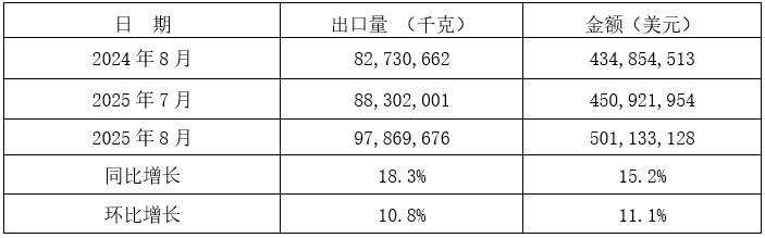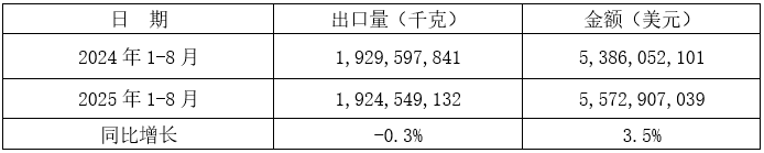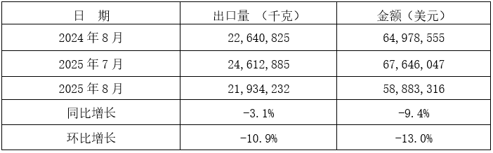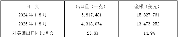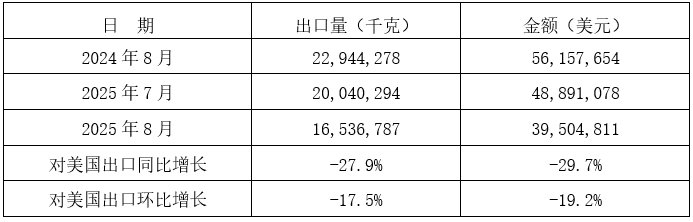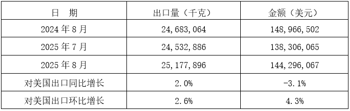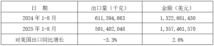 其中8月份,20个税则号共计出口55.5万吨,同比增长1.1%,环比增长3.7%;出口金额15.5亿美元,同比增长3.1%,环比增长3.5%。对美国出口11.1万吨,同比下降24.4%,环比下降17.6%;对美国出口金额3.4亿美元,同比下降7.9%,环比下降4.3%。