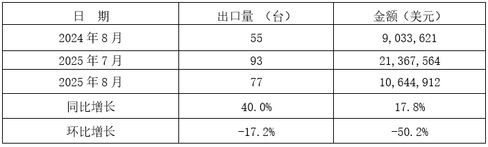 其中:8月份出口77台,同比增长40.0%,环比下降17.2%,见表19和表20。