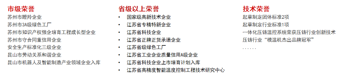 ● 行业口碑认可:连续两年斩获压铸行业 “模温机杰出品牌冠军”,2019 年成功通过知识产权贯标认证,获评苏州市瞪羚企业,并入选昆山市机器人及智能制造产业领域企业库。一系列荣誉不仅是对公司实力的肯定,更奠定了其在工业温控领域的领先品牌地位。
