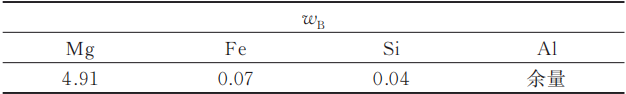 图1 拉伸试样尺寸示意图 图2为铸态AM合金的OM和SEM微观组织。可以看出,铸态AM合金晶粒粗大,平均晶粒尺寸为550 μm。同时,在晶粒内部观察到了羽毛状枝晶组织。在铸态AM合金的SEM微观组织中观察到了平均尺寸为5 μm的块状第二相,且存在孔洞缺陷,见图2b。对A点基体和B点第二相进行EDS分析(见表2)。结果表明,块状第二相由Al和Mg组成,为Al-Mg相,且两者比值接近3∶2。结合研究分析,判断铸态AM合金中的Al-Mg相为Al3Mg2相。此外,对图2b中白框区域进行EDS面扫分析,见图3。可以看出,铸态AM合金内的Mg在基体中分布不均,偏析现象严重。