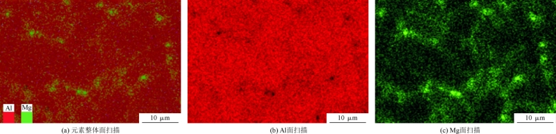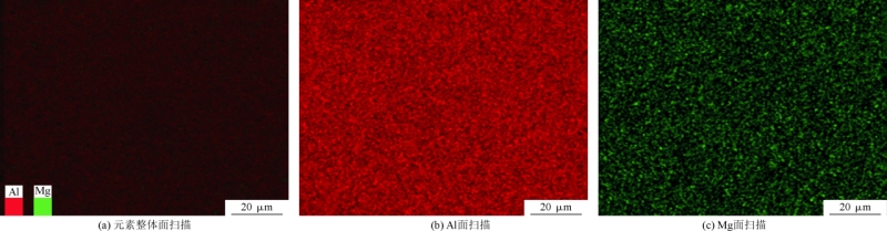 图3 铸态AM合金的EDS面扫元素分布图 连续流变挤压态AM合金的OM和SEM微观组织及XRD分析见图4。对比铸态AM合金,在流变挤压态AM合金的OM组织中未观察到明显的枝晶组织,均为细小的等轴晶粒,平均晶粒尺寸为48.6 μm,见图4a。同时,在流变挤压态AM合金的SEM微观组织中也没有观察到明显的第二相析出,见图4b。对图4b中C点基体进行EDS能谱分析,结果见表2。此外,对图4b进行EDS面扫描分析,结果见图5。结合XRD图谱可知,连续流变挤压过程中AM合金内的Mg完全固溶且均匀分布于基体中。
