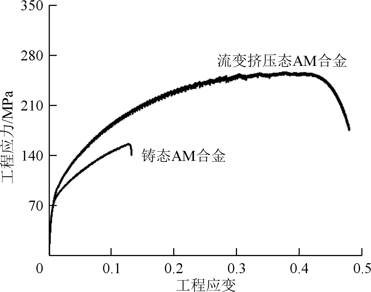 图6 铸态和流变挤压态AM合金的工程应力-工程应变曲线