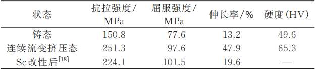 图7 铸态和连续流变挤压态AM合金的拉伸断口形貌 结论 (1)连续流变挤压过程中消除了粗大的枝晶组织,合金内均为细小的等轴晶,平均晶粒尺寸为48.6 μm,小于铸态Al-5Mg合金的晶粒尺寸(550 μm),表明连续流变挤压过程对枝晶和晶粒有较好的细化作用。 (2)连续流变挤压态Al-5Mg合金内等轴晶的形成是由连续流变挤压变形过程中摩擦剪切与冷却的耦合作用导致的。较高的冷却速率有利于凝固组织的细化和Mg的均匀分布,随后的摩擦剪切变形使合金发生动态再结晶,使晶粒尺寸进一步细化。 (3)连续流变挤压态Al-5Mg合金的抗拉强度、屈服强度和伸长率分别为251.3 MPa、97.6 MPa和47.9%,比铸态Al-5Mg合金分别提高了66.6%、25.8%和262.9%,同时综合力学性能优于稀土改性后的Al-5Mg合金,合金的强化机制主要包括晶界强化、固溶强化和位错强化。