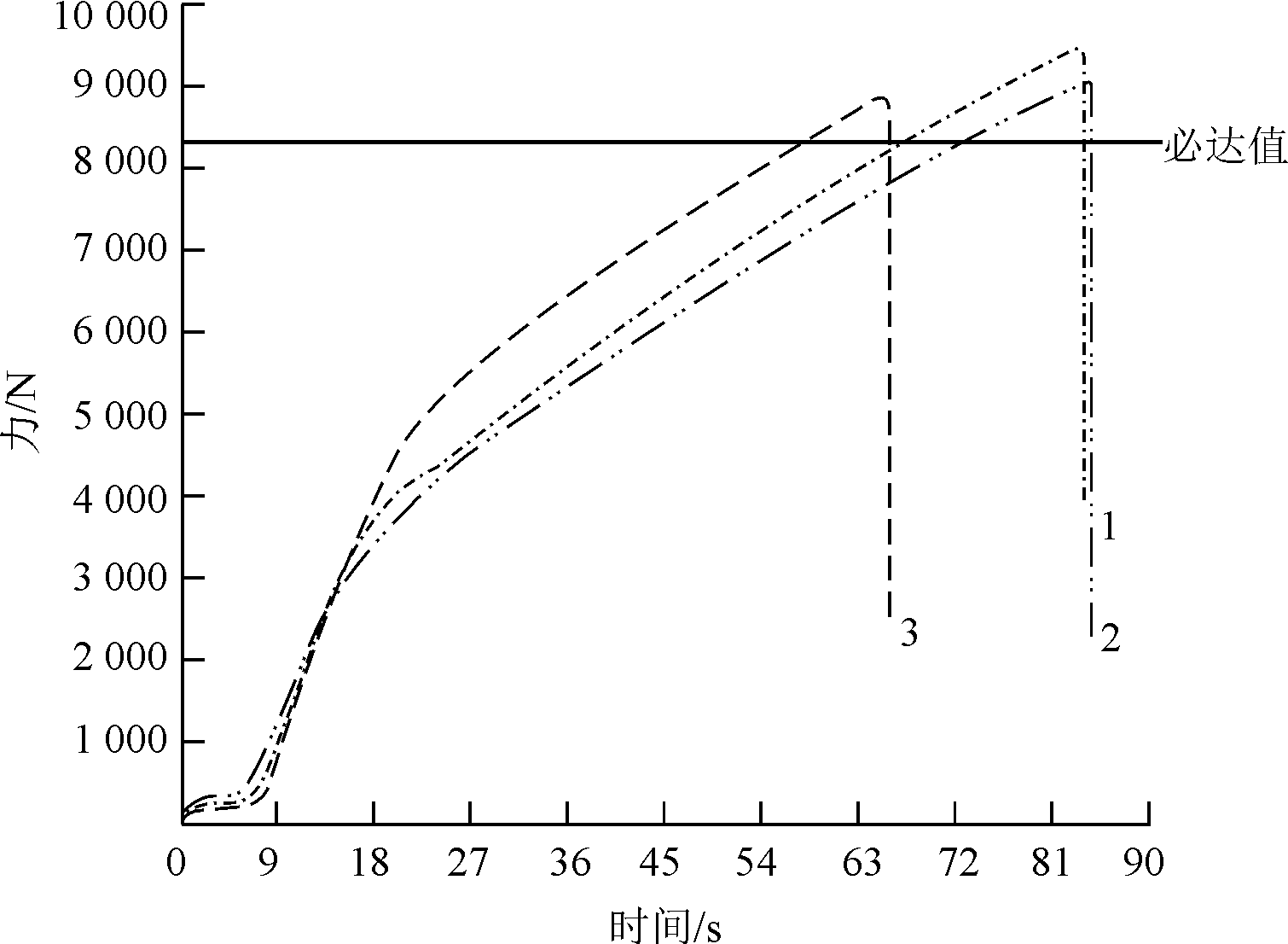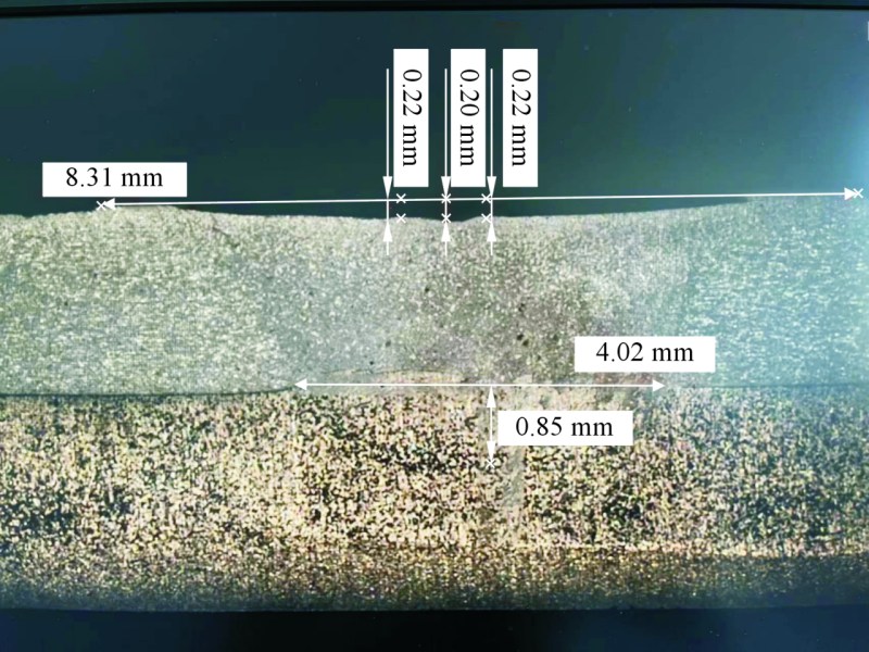 注:×表示金相或拉伸NG;—表示未做此组;○表示质量合格; 虚线框内为工艺窗口。 经过评估,选择搅拌摩擦焊技术和铸件本体复合水冷通道的设计,并采用双机器人搅拌摩擦焊工作站和静轴肩焊具的生产方案来制造超大型一体化电池托盘。 通过双机器人搅拌摩擦焊技术成功制造出高质量的超大型一体化电池托盘。焊接接头的外观光滑、无明显缺陷,内部无气孔、裂纹等缺陷。图7为搅拌摩擦焊断面金相组织。搅拌摩擦焊后板减量要求≤0.4 mm,实测为0.22 mm,满足要求(见图7);力学性能要求为≥8 225 N,拉伸样件平均测量值为9 130 N,图8为搅拌摩擦焊拉伸力-时间图。可以看出,达到设计要求。