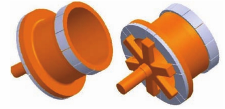 表1 A356 合金化学成分 wB/% 如图 1 所示为铸件三维形状,其法兰直径为Φ650 mm,筒体外径为Φ478 mm,内径为Φ446 mm,整体高347 mm。铸件体积为0.018 4 m³,表面积为1.43 m²,质量为49.2 kg。筒体最小壁厚12 mm,最大壁厚16 mm,法兰厚38 mm。要求不得有气孔、夹砂、缩松等铸造缺陷。