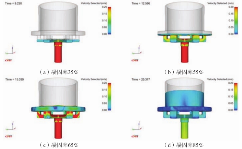 图12 充型过程压力场 速度场数值模拟结果(图13)分析:浇注系统及铸型内铝液最高速度为0.15 m/s,速度差普遍在0.1 m/s以下,液面上升平稳。图13(c)中,铸型法兰内速度差为0.125 m/s,液面由法兰进入筒身时产生波动。图13(d)中,铸型内速度差为0.05 m/s,铝液流动状态平稳。
