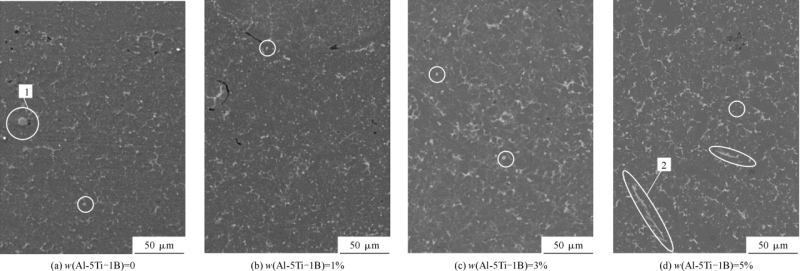 图7 不同Al-5Ti-1B含量的TiB2/ADC12铝合金SEM形貌