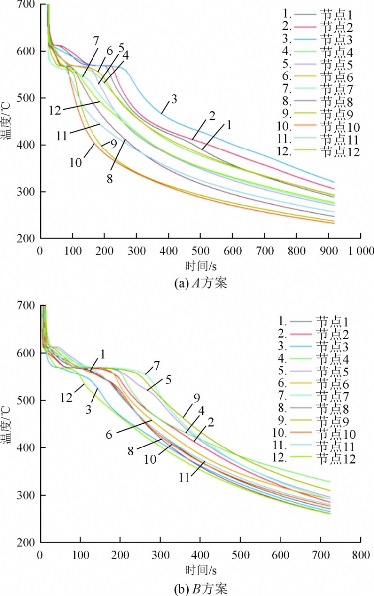 图8 方案A和方案B各节点温度变化数值模拟结果示意图