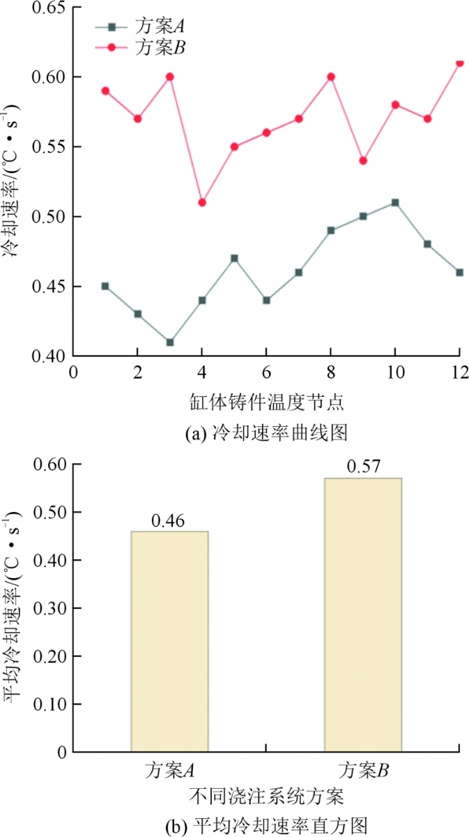 图6 方案B充型过程的温度场变化示意图 在铸件冷却凝固过程中,冷却速率是评价铸件成形品质的重要指标。随着冷却速率增加,金属过冷程度则会相应的增大,其对凝固组织的影响也会随之增大。从形核机理来看,形核率随过冷度的增加而升高,同时也使合金的微观组织更加细化。此外,当温度迅速下降时,形成的大量晶粒在生长前就被冷却凝固,进一步细化了晶粒组织。 针对方案A和方案B所得到的缸体铸件,分别选取12个节点进行温度变化研究。为保证计算结果的精度,在选择温度节点时应使节点的选取更加均匀,故将缸体铸件从顶部到底部划分为4个梯度,在每个梯度高度处选取3个温度变化点。图7为缸体铸件温度节点的分布示意图。12个节点的温度变化情况见图8。可以看出,A、B两方案在节点温度上均符合浇注温度-液相线温度-固相线温度-室温的顺序,并且在曲线中未出现温度畸变严重的节点。 选取浇注温度(700 ℃)至合金材料固相线温度以下(220 ℃)的温度变化区间和冷却凝固时间,通过计算冷却速率,直观地比较A、B两方案下各节点冷却速率的大小。图9为A、B两种浇注系统方案下12个节点的冷却速率曲线图和平均冷却速率直方图。可以看出,A、B两方案下的12个节点的平均冷却速率分别为0.46和0.57 ℃/s。与方案A相比,方案B的冷却速率提高了23.91%,其具有较高的冷却速率,能减少铸造缺陷的产生。