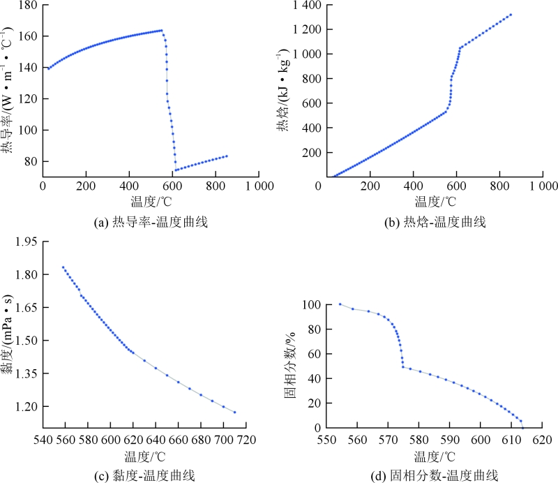 ![]() 铝合金具有良好的铸造性、低密度和高强度等特点,已在汽车、航空航天等领域广泛使用。发动机是驱动车辆的重要部件,需要具备良好的力学性能,但由于发动机工作环境恶劣,因此对铝合金缸体的铸造成形质量有较高的要求,提高铝合金缸体铸件的性能以及降低铸件缩孔、缩松缺陷成为当前研究的热点问题之一。目前,通过有限元仿真技术模拟分析铸件的铸造成形过程并改善成形品质得到广泛应用。对于合金铸件,需要合理的浇注系统来保证其铸件成形质量。宗学文等运用有限元仿真方法,研究不同方案对叶轮铸件的充型过程、凝固过程以及缩孔缩松的影响。通过数值模拟发现底注式方案优于顶注式方案,并经过实际生产验证,叶轮铸件成形质量较好,力学性能合格,满足钛合金铸件的要求。郭居魁等以吊舱薄壁铸件为研究对象,对初始浇注系统方案进行改进(增加内浇道,并优化内浇道的形状),提高冒口对缩孔缩松的补缩能力,改善了铸件成形质量。经数值模拟可知优化改进后的方案减少了镁合金薄壁铸件的缩孔缩松缺陷。研究者们设计了不同的浇注系统方案,研究各方案对铸造过程中金属液的充型温度场和固相分数变化的影响,并防止在铸造过程中缺陷的形成。结果表明,优化后的浇注系统有效地防止了铸件缩孔、缩松缺陷的产生。对发动机支架的浇注系统结构进行了分析。根据铸造工艺要求设计了不同浇注系统方案,并分别进行数值模拟分析。结果表明,经优化改进后的浇注系统增强了金属液的流动性,使充型更加完整,减少了浇注过程中的氧化夹杂物和铸造缺陷,提高了发动机支架铸件的品质。 综上,通过对浇注系统的优化设计可以获得成形品质较好的产品。本研究采用数值模拟和生产验证的方法,对ZL101A铝合金缸体铸件的浇注系统进行优化设计,研究不同浇注系统设计方案对缸体铸件的充型过程、凝固过程的冷却速率以及缩孔、缩松的影响,以期减少铸造缺陷,获得成形品质较好的铸件,为铝合金铸件的铸造工艺设计和实际生产提供参考。 图文结果 以某型4缸发动机缸体作为对象,其三维模型见图1。缸体铸件质量为18.83 kg,缸筒内径为ϕ68 mm,轮廓尺寸为371.5 mm×348.7 mm×282.6 mm。铸件材质为ZL101A铝合金,其化学成分见表1。通过JMatPro软件计算可得到合金的热物性参数,见图2。该合金的液相线温度为616 ℃、固相线温度为556 ℃。