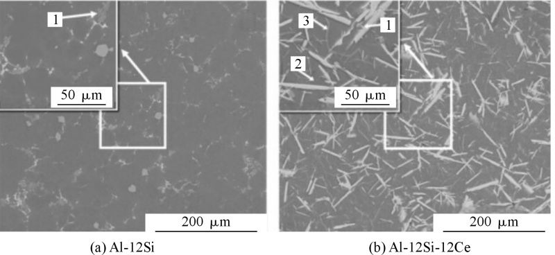图9 Al-12Si和Al-12Si-12Ce合金的SEM照片