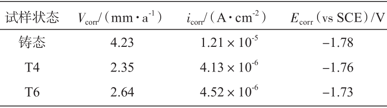 图2 不同样品的XRD图谱 2.2 浸泡及电化学腐蚀测试 为了更好地证明热处理对镁合金腐蚀性能的影响,将三种不同条件的镁合金浸泡在Na2SO4溶液中三天,通过失重法计算了各自条件下的腐蚀速率(Vcorr)。此外,还测得了三种试样的极化曲线,如图3所示,失重法以及极化曲线各自的计算结果如表2所示。