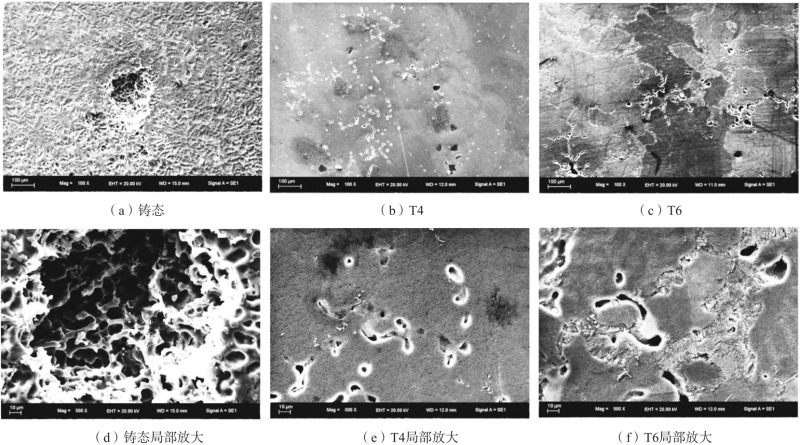 表2 样品的腐蚀速率 在质量损失测试中,不同热处理状态样品的腐蚀性能表现出显著差异。腐蚀性能优劣顺序为T4处理最优,其次是固溶时效处理,最差的是铸态样品。这一现象的产生机制在于:在微观电偶腐蚀过程中,β相为阴极,而α-Mg则作为阳极相,两者构成的微电池体系加速了镁基材料的腐蚀进程。研究数据表明,T4热处理后试样的抗腐蚀能力较铸态材料提升了44.4%,这主要得益于加速腐蚀的β相充分溶解到镁基体中,从而抑制了电偶腐蚀的形成。另一方面归因于镁基体中铝含量的增多,而铝含量的增多又会导致腐蚀电位的增大(图3)。经过T6热处理后,原本溶解于镁基体中的β相发生再析出现象,这些析出相主要分布于晶界位置以及晶粒内部。相较于原始铸造状态,新生成的β相颗粒尺寸更为细小且在基体中的分布更为均一。这种细小且均匀分布的析出相能够有效提升材料的耐腐蚀性能,与粗大且分布不规则的β相相比表现出更优的抗腐蚀特性。试验数据显示,T6处理样品的腐蚀抗力较铸态试样提升了37.6%。然而,电化学测试中发现,铸态、T4和T6样品的腐蚀电流密度分别为1.21×10¯5、4.13×10¯6和4.52×10¯6 A·cm ¯²,电化学测试测得的腐蚀电位数值分别为-1.78 V、-1.76 V和-1.73 V。基于这些数据可推断,三种热处理状态样品的腐蚀性能优劣顺序为T6>T4>铸态,其中T6处理样品表现出最优的耐腐蚀特性。值得注意的是,这一排序结果与之前通过质量损失法获得的腐蚀速率评估结论存在一定差异,原因为经过时效处理后基体中β相大量析出,且数量相对于铸态来说大大增加(图2),根据混合电位理论,导致电位升高。另一方面,由于长时间的浸,而电化学测试过程时间较短,不存在物理脱落过程,导致腐蚀速率较低,电流密度较小。 2.3 腐蚀形貌 经3天Na2SO4溶液浸泡腐蚀试验后,利用扫描电子显微镜(SEM)对热处理前后AZ91镁合金的表面特征进行了表征,结果如图4所示。图4(a)-(c)中分别呈现了铸态、T4及T6处理样品的宏观腐蚀形貌,图4(d)-(f)则提供了三者对应的局部细节放大图。对图4中各样品微观形貌的分析表明,腐蚀破坏的严重程度存在明显梯度。其中,铸态样品的表面损伤最为严重,呈现大范围的剥落现象;T6处理样品次之;T4处理样品的腐蚀程度最轻,表面相对最为完整。这一形貌观察结果与表2中通过失重试验计算得到的腐蚀速率数据表现出高度的一致性。镁合金材料的腐蚀特性与其内部微观结构密切相关,其中β相起着决定性作用。该相的几何尺寸、空间分布及体积分数等参数均会显著影响材料的腐蚀行为。根据Aung等学者的研究观点,β相在腐蚀过程中表现出矛盾的双重效应:首先,作为阴极相与阳极α-Mg构成电偶腐蚀体系,产生微观电流从而加速镁基体的溶解过程;其次,β相本身具有优异的抗腐蚀特性,能够在一定程度上形成物理屏障,抑制腐蚀的进一步扩展,从而提升镁合金的整体耐腐蚀能力。