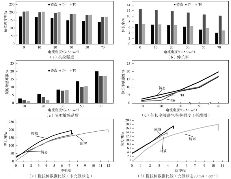 图4 不同条件下的腐蚀表面形貌 对于铸态样品而言,其组织结构中β相以粗大骨骼形态呈现,呈不连续网状分布于晶界区域,如图1(d)所示。这种组织特征形成了典型的"大阴极-小阳极"电偶腐蚀体系,显著加剧了基体材料的腐蚀进程。SEM观察结果表明,如图4(d)所示,腐蚀表面形成了深度明显的腐蚀坑洞,β相周边的α-Mg基体几乎完全溶解,仅留下裸露的骨骼状β相框架,导致腐蚀程度最为严重。 当样品经过T4热处理后,原有的粗大骨骼状β相完全溶解到镁基体中,如图1(b)所示,有效削弱了微电偶腐蚀效应。电镜分析显示,如图4(e)所示,腐蚀表面仅观察到少量分散的点蚀坑,表现出最佳的耐腐蚀性能。 经过T6处理的样品,先前溶解的β相重新析出,以连续颗粒状和断续层片状形态均匀分布于基体内,如图1(e)所示。相较于铸态样品,其腐蚀抗性显著改善,表面呈现少量点蚀现象,且腐蚀主要集中于晶界区域,如图4(c)所示。进一步的高倍率观察发现,如图4(f)所示,晶界处的α-Mg优先被腐蚀,残留的层片状β相清晰可见。T6处理虽然使整体腐蚀抗性较铸态有明显提升,但晶界优先腐蚀现象可能与该区域β相的不连续析出特征有关。而晶内为连续析出的颗粒状β相,层片状相对于颗粒状尺寸较大,造成局部的阴阳比率相对于颗粒状较大,有较高的腐蚀速率。 2.4 恒应变速率拉伸测试 图5展示了不同充氢电流密度条件下各试样的慢拉伸力学性能参数。试验结果表明,充氢处理对AZ91镁合金的力学性能产生显著影响,且影响程度因热处理状态而异。