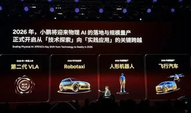 1月8日,在2026小鹏全球新品发布会上,何小鹏表示,小鹏面向 2026年的两大关键词是物理AI和全球化。2026年,小鹏将迎来物理AI的落地与规模量产,正式开启从“技术探索”向“实践应用”的关键跨越。今年还将开启运营 Robotaxi(无人驾驶出租车),并规模量产人形机器人和飞行汽车。