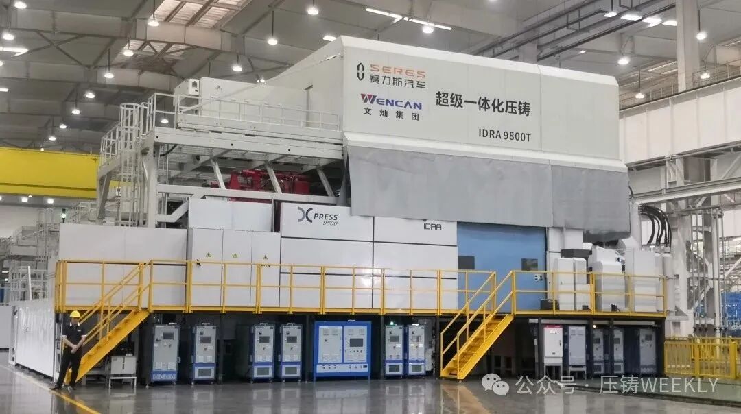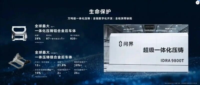 作为赛力斯技术实力的核心载体,问界品牌已构建起差异化的制造技术壁垒。在车身工艺领域,问界汽车超级工厂,配置了7000吨、9000吨、9800吨等型号的超大型压铸岛,生产前机舱、后车体、CD柱等一体化压铸件。其中,一体化压铸后车体将传统工艺中分散的87个零件集成为单一结构零部件,减少820个连接点的同时实现28%的减重效果 。这一技术已在问界M9、M8等车型量产落地。