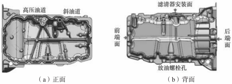 油底壳作为汽车发动机的重要零部件,安装在发动机底部。其主要功能是存储机油并封闭曲轴箱,同时保护发动机下部的油路组件。油底壳具备较强的耐磨和抗冲击能力,能够起到缓冲和分散碰撞力的作用,还可以防止发动机油液泄漏,保持发动机内部的正常工作温度。油底壳的密封、储油和吸油功能中的任何一项丧失都将造成发动机严重损坏。新一代的汽车发动机油底壳零件结构复杂、壁厚不均和气密性要求高,在压铸过程中会出现涡流裹气、金属液难以均匀补缩现象,导致铸件内部存在气孔、缩孔等缺陷,容易造成零件废品率高、成本浪费,需对压铸工艺进行深入分析和持续改进。