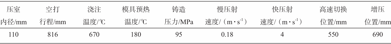 压铸件理论高速切换位置为金属液填充至内浇道位置,该油底壳铸件理论高速位置为590 mm,但由于内浇道为上下排列,底部的内浇道会提早进料,导致铸件底部位置出现冷隔问题,故将高速切换点设置为550 mm,具体压铸工艺参数见表1。