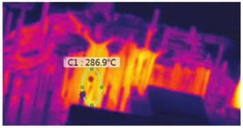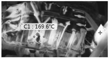 高压油道孔泄漏问题为内部缩孔导致,部分泄漏产品缩孔外露导致裂纹产生,油道位置为产品热节所在,油道铸销高压点冷无法完全冷却该位置,使用热成像仪对该位置模具温度进行检测,油道铸销位置整体温度近290 ℃,如图9所示。通过调整铸销高压点冷通水流量,延长通水时间,无明显改善效果,初步判断存在其他影响因素。通过反复确认CAE模拟结果,发现油道铸销正处于操作侧末端两股流道交汇处,如图10所示,两股流道直冲油道铸销且融合不良,从而导致铸销温度过高产生缩孔甚至缩孔外露。