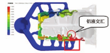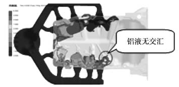 (2)对于油底壳靠近内浇道位置的预铸孔位,其预铸销本身受相近浇道直冲的影响,容易造成粘模,导致铸销温度升高,需要频繁进行清理和更换的情况下,结合CAE数值模拟,对浇注系统进行优化改进,确保在铸销位置不会形成多股流道交汇、融合不良的现象,可以有效改善铸销因粘模导致温度过高形成内部缩孔从而造成产品泄漏的问题。