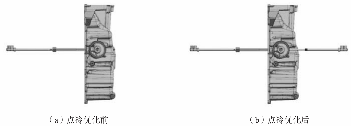 依据缺陷所在对模具进行优化调整,将操作侧最末端一股流道进行封堵,如图12所示,同时,在定模芯新增一组高压点冷对高压油道孔底部壁厚位置进行点冷,加强热节位置的冷却,如图13所示。
