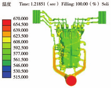 由于该油底壳内腔为产品顶出位置,因此内腔以动模成形,方便产品顶出,减小包紧力的作用,从而保证产品的平面度;且滤清器安装面、放油螺栓孔及后端面为3组滑块所在位置,如图1(b)。故依据该油底壳结构选定分型及进料方式如图3所示:整体进料方式为竖直进料,以油底壳前端面为进料位置,可以避免分流锥设置在滑块上容易卡死的风险。共设计10组内浇道进料,后端面为填充末端。对该浇注系统进行初始数值模拟,模拟结果显示,铸件充型完成时整体温度偏低,如图4所示。原因为浇注系统流程长,充型过程中热量损失大,充型末端容易形成冷料聚集,从而导致加工后气孔、夹渣缺陷增多。且底部两股流道优先进料,容易形成冷隔,导致抛丸后起皮,如图5所示。