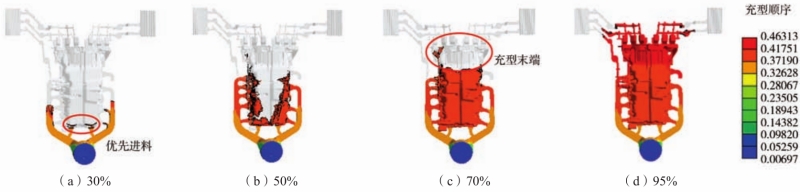 油底壳铸件采用1650T压铸机,压室内径110 mm,空打行程816mm,铸件重量8.34kg,铸件体积3147cm³,金属液在压射室内的初始高度为50 mm,依据公式(2)计算得出压射冲头的理论最大临界速度为0.6m/s。使用AnyCasting软件进行数值模拟,观测铝合金液在完全充满压室前的充型流态,结果如图7所示。