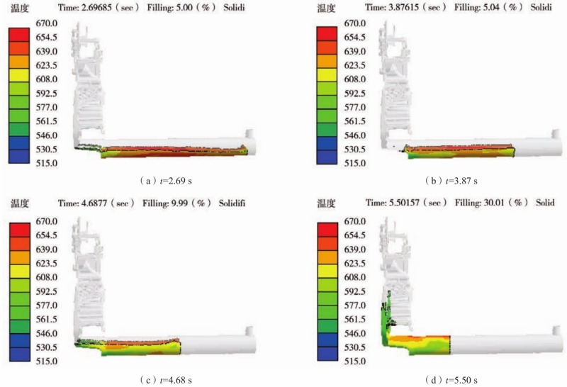 依据模拟结果显示,铝合金液在压室内温度始终保持在液相线+30 ℃以上,且低速充型过程中,随着冲头向前推进,铝液充型平稳,无卷气现象产生,避免了压室内气体的卷入。