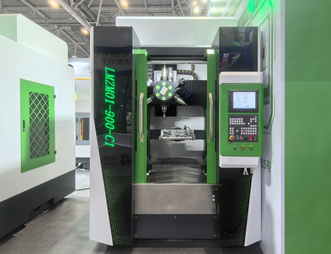 除针对性产品设计外,江苏绿研设备的技术优势更体现在通用性能与效率精度的突破上。据段亚斌介绍,三款参展设备均采用床身龙门架构与六轴联动摇篮单工位设计,配备集成4个主轴、1个同心磨头及1个浮动锉刀的六动力头专用刀盘,可灵活组合刀具应对多样化工艺需求;动力头可选配的浮动头装置能吸收产品变形量,实现刀具保护并降低调试难度。同时,设备采用双横梁布局与10轴联动控制,结合摇篮C轴与A轴协同动作,可完成“正面—侧装—背面”全流程加工,一次装夹即可覆盖产品六个面,精准兼顾加工效率与精度。