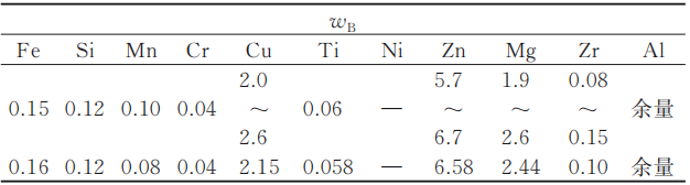 本研究用材料为7050合金铸锭,其化学成分见表1。熔炼采用功率为12 kW的电阻炉,其额定温度为1 200 ℃,炉膛尺寸为ϕ200 mm×350 mm,坩埚为铁坩埚,坩埚内壁涂抹冶金用氮化硼涂料。