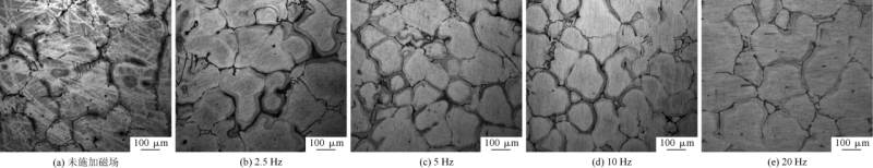 图8是脉冲电压为300 V,模具温度为600 ℃、浇注温度为760 ℃条件下不同频率脉冲磁场对7050铝合金微观组织的影响,合金晶粒尺寸见图9。可以看出,因为温度梯度减小,铝合金的凝固速率变小,未施加脉冲磁场的7050铝合金晶粒变得更为粗大且不均匀,平均晶粒尺寸达到338 μm(见图8a和图9),且部分晶粒同样为树枝晶形貌。