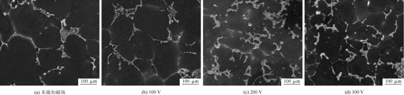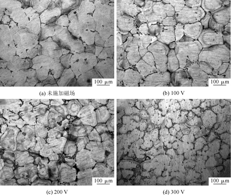 图11为不同电压脉冲磁场作用下获得的7050铝合金铸态显微组织。图12为平均晶粒尺寸统计结果。可以看出,未施加脉冲磁场时,7050合金凝固组织晶粒粗大且不均匀,平均晶粒尺寸为240 μm,部分晶粒为树枝晶形貌。不同脉冲电压下7050铝合金的铸态凝固组织晶粒明显得到细化,并随着脉冲电压的升高而减小,当脉冲电压为300 V时,细化效果最为明显,晶粒细小且均匀,平均晶粒尺寸为106 μm,相较于未施加磁场减小了56%,且均为等轴晶形貌。