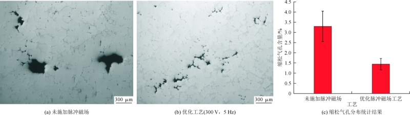 图16为优化工艺和未施加脉冲磁场条件下7050合金凝固组织中缩松气孔分布及统计结果。可以看出,由于试验过程中采用高纯氩气除气,由于时间选择较短,除气不够充分,所以两种条件下都存在缩松和气孔缺陷,但施加脉冲磁场优化工艺参数后,缩松和气孔明显减少和变小。统计结果显示,缩松和气孔平均含量由3.29%减小到1.44%,减少了56.3%。