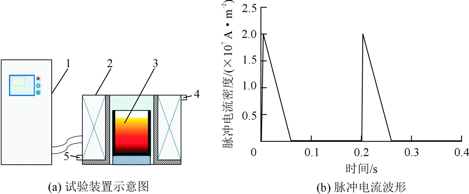 首先将试验所用的合金锭表面打磨,放入保温炉中预热至300 ℃,去除水分。将坩埚加热至760 ℃,然后加入预热过的7050合金锭。合金熔化后采用高纯氩气搅拌除气5 min,然后除渣,保温15 min,浇注前将熔体降温至730 ℃或760 ℃。将三高石墨模具在电阻炉内预热至300 ℃或600 ℃。浇注前将脉冲电源打开,然后将铝熔体通过预热至300 ℃或600 ℃的溜槽浇入石墨模具,脉冲磁场作用时间为20 min。试验装置示意图和脉冲电流波形见图1。脉冲磁场条件下7050合金凝固试验参数见表2和表3。