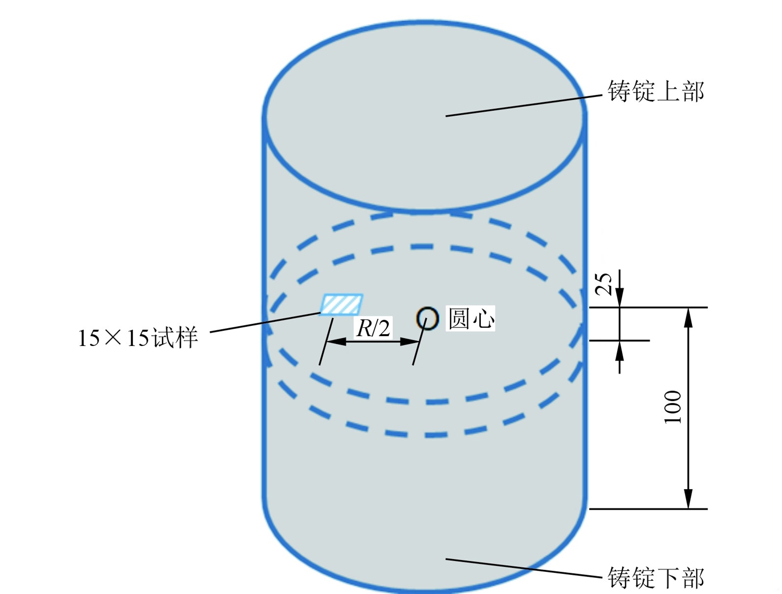 用于显微组织观察分析的金相试样均取自铸锭中部(距离铸锭底部100 mm),切取25 mm厚圆片(见图2中虚线位置)。宏观组织试样采用精密车床进行表面加工并经磨床打磨,然后用1号化学腐蚀剂(5 mL的HF+25 mL的HNO3+75 mL的HCL)进行表面腐蚀,然后用ScanMaker i800 plus高清晰扫描仪扫描宏观组织。微观组织观察金相试样尺寸为15 mm×15 mm×25 mm,依次使用200、600、1 200和2 000号砂纸对金相试样进行预磨,细绒布抛光后,用2号化学腐蚀剂(5 mL的HF+95 mL的去离子H2O)进行表面腐蚀。采用Axiovert 200MAT光学显微镜和JSM-6460型扫描电镜(SEM)进行显微组织分析。