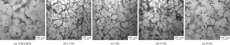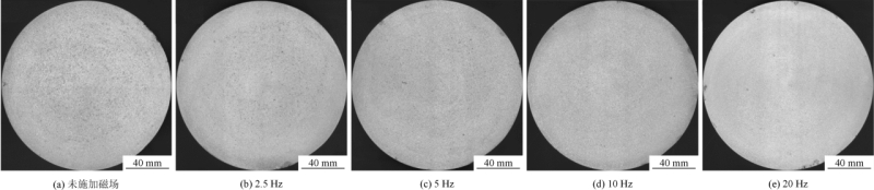 图3为不同脉冲频率下7050铝合金的宏观组织(脉冲电压为300 V,模具温度为300 ℃、浇注温度为730 ℃)。可以看出,未施加脉冲磁场时,7050合金铸锭内部和边缘组织不均匀,而施加不同频率的脉冲磁场后,铸锭内部和边缘的组织明显更均匀,且晶粒更细小。