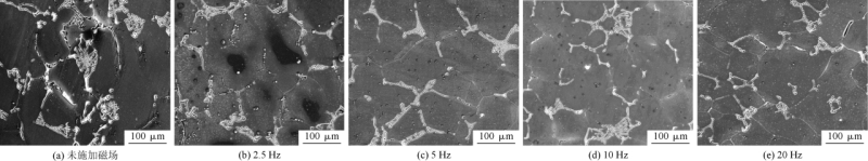 图4为不同频率脉冲磁场作用下获得的7050铝合金铸态显微组织(脉冲电压为300 V模具温度为300 ℃,浇注温度为730 ℃)。图5为平均晶粒尺寸统计结果。可以看出,未施加脉冲磁场时,7050合金晶粒粗大且不均匀,平均晶粒尺寸为240 μm,且部分晶粒为树枝晶形貌。施加脉冲磁场后,晶粒明显得到细化,随着脉冲频率升高,晶粒尺寸呈先减小再增大趋势。当脉冲频率为5 Hz时,细化效果最为明显,晶粒细小且均匀,平均晶粒尺寸为106 μm,且均为等轴晶形貌,相较未施加磁场时平均晶粒尺寸减小了56%。