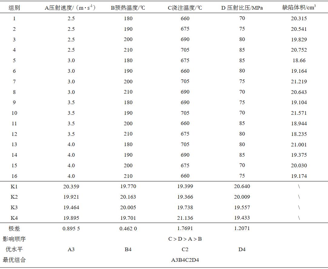 本试验方案需要进行16组正交试验,基于试验方案中提供的数据,对壳体的充型与凝固过程进行模拟。并对以上16组数据的铸件缩松、缩孔等缺陷体积大小进行统计对比,最后得到正交试验数据如表4所示。