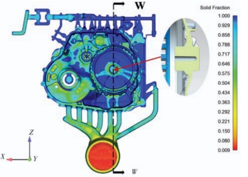 冷铁选择H13模具钢为材料,通过3D打印制成,并在其中设计冷却管道通入常温水散热,将冷铁与浇注系统组合后,采用优化后得到的工艺参数对变速器壳体的充型与凝固过程进行模拟。在底部厚大区域处选取横截面W进行分析,以方便对优化前后的结果进行更加明显的对比,横截面W选取位置如图7。