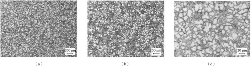 通过对比该截面在相同时刻的温度变化、固相分数以及缺陷大小(表5),可以发现,在相同时间下,优化后铸件厚大区域的固相分数较优化前有所增加,凝固时的温度相对降低,最终影响到缩松和缩孔等缺陷体积也相对减小。为验证优化后压铸工艺的合理性,通过试样试制,使用金相显微镜观察该区域的金相组织,如图9所示,发现该区域金相组织为等轴晶,各相分布整体均匀,无缩松和孔洞等缺陷,说明该冷却镶块起到了减小底部厚大区域缺陷的作用。
