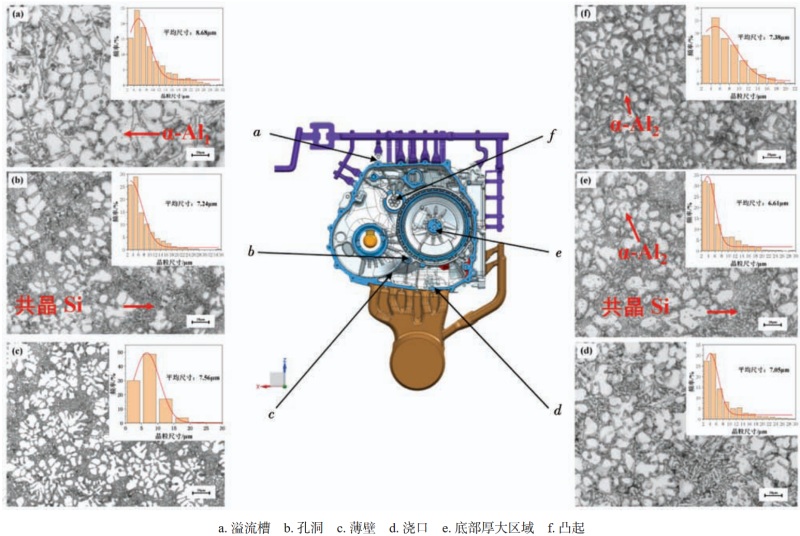 在铝合金壳体的铸造过程中,不同结构处由于壁厚不同,凝固顺序与冷却过程也存在着差异,因此选取并观察了铸件出现缺陷风险较高、冷却时间不同的六个特征位置(a溢流槽、b孔洞、c薄壁、d浇口、e厚大区域和f凸起),如图10所示。壳体组织主要以α-Al与共晶Si为主,各区域都是等轴晶,其中共晶Si分布在α-Al周围。初生α-Al相在图中表现为两种形式,分别为凝固过程中冷却速率较低所形成较大的α-Al₁,与冷却速率较高所形成的较小的α-Al₂。根据晶粒尺寸分布图可以看到,溢流槽处,如图10(a)所示,平均晶粒尺寸最大,且存在着较多尺寸较大的α-Al₁相。底部厚大区域,如图10(e)所示,平均晶粒尺寸最小,为较小的α-Al₂相。其余孔洞、薄壁、浇口以及凸起区域晶粒尺寸相差不大,且多为尺寸较小的α-Al₂相。