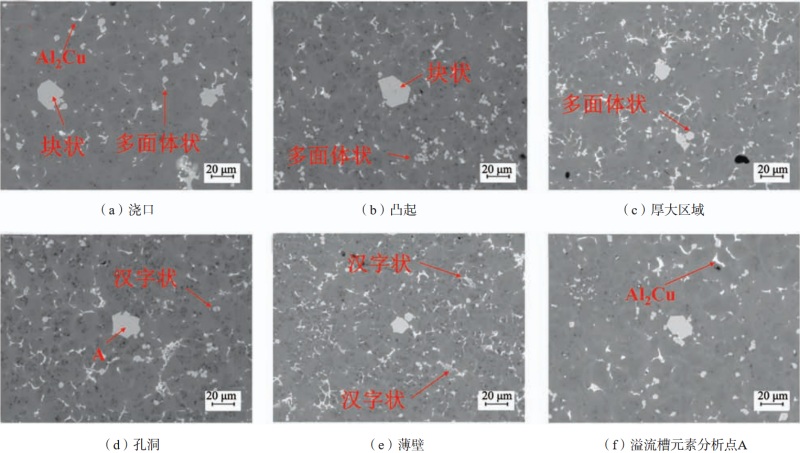 (3)对试制铝合金铸件的浇口、凸起、厚大区域、孔洞、薄壁和溢流槽等六个冷却速率不一致、缺陷风险较高的部位进行微观组织观察,结果显示六个部位均未发现明显的缩松、缩孔缺陷,微观组织均匀,主要为细小的α-Al相,晶粒尺寸集中分布在5~15 μm。α-Al相周围均匀分布着析出的Al₂Cu以及富铁相,富铁相α-Fe主要呈块状和星状,有助于提高铸件性能,未发现有害的针状β-Fe相。