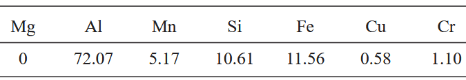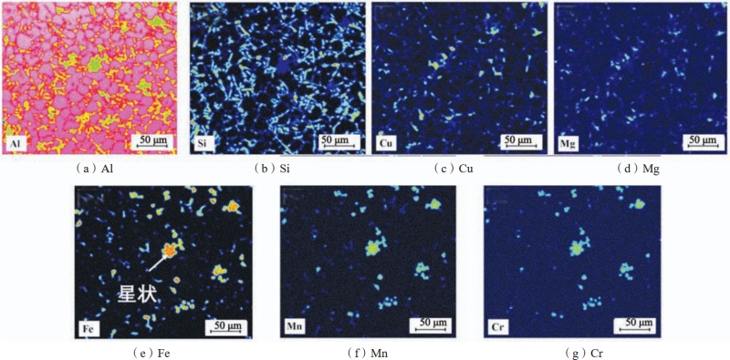 如图11和图12所示,Si元素分布在α-Al基体周围,Mg元素与Cu元素分布规律近似,分布在α-Al相周围的Si基体中,而Fe、Mn和Cr则更多地富集在一起。如图12所示,Mg的含量较少(如表1所示,加入量在1.0%以下),多分布于共晶Si相与α-Al的交界处,起到细化共晶Si、促进材料内部合金元素扩散、提高材料的力学性能的作用。在合金中还观察到高密度的较亮化合物(图11(a)、(f)),它们以细片的形式与α-Al相形成共晶结构,形成Al₂ Cu相。Al₂Cu相以片状和块状颗粒的形式出现,研究表明,片状Al₂ Cu相较块状硬度更高,具有更好的强化效果。