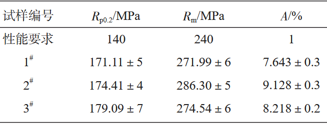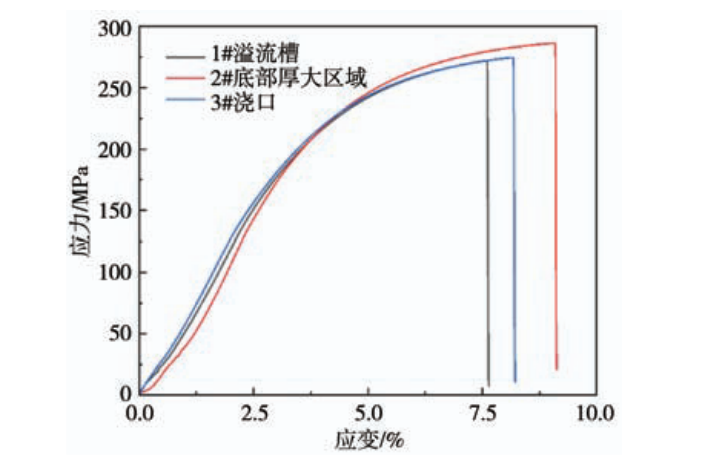 铸件的力学性能测试结果如图13以及表7所示,其中1 #、2 #与3 #数据分别为溢流槽区域、底部厚大区域以及浇口区域各取三个试样获得的平均值,根据表中数据显示,铸件整体的力学性能优异,各指标均满足并高于铸件技术要求。因而综合铸件微观组织与力学性能测试可以判断该工艺下的铸件有着均匀的微观组织与良好的力学性能。