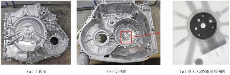 通过实际生产试制,如图14(a)和(b)所示,以及对出现缺陷风险较高的底部厚大区域进行X射线探伤检测,如图14(c)所示,可以确定得到了表面质量良好且无明显的缩松、孔洞等缺陷的变速器壳体。因而综合铸件微观组织观察、力学性能测试以及实际生产验证可以判断,在该压铸工艺参数下得到的铸件有着良好的表面质量与工艺性能