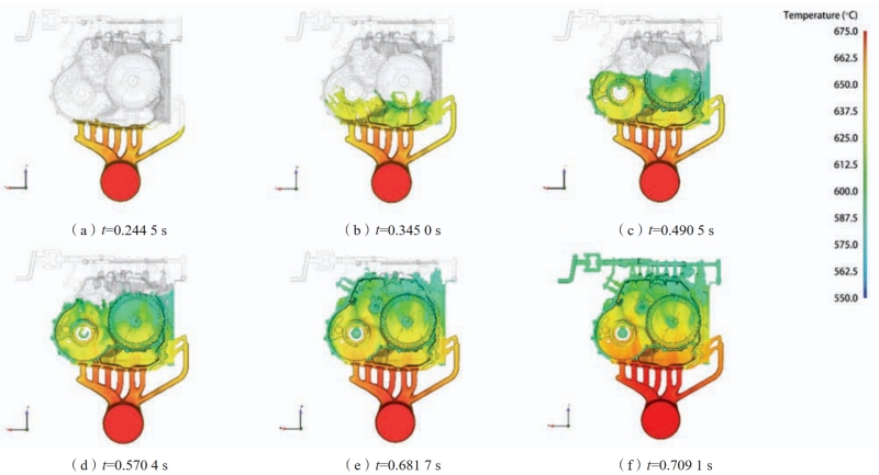 图4为真空压铸铝合金壳体的充型过程。首先,在t=0.224 5 s时,熔融的ADC12铝合金通过内浇口进入型腔,金属液从不同浇口向前填充的距离大致相同,如图4(a)所示。当铝液继续流动时,型腔中部的熔液形成了封闭区域,出现夹带空气现象,这是由于该部位存在一个接近90°充型方向的变化,金属液充型时产生一定阻力阻碍了部分金属液的流动,从而导致不同流速铝液在汇合时出现了夹带空气的现象,如图4(b)所示。从t=0.490 5s到t=0.681 7s,如图4(c)到图4(e)所示,金属液流动较为平稳,铸件顺利完成充型,随后溢流槽与排气槽开始充型。在t=0.709 1s时,充型全部完成,如图4(f)所示。金属液在充型过程中整体较为平稳,但存在着一定的卷气现象,表明浇注系统设计合理,但压铸工艺参数需要一定的调整优化。