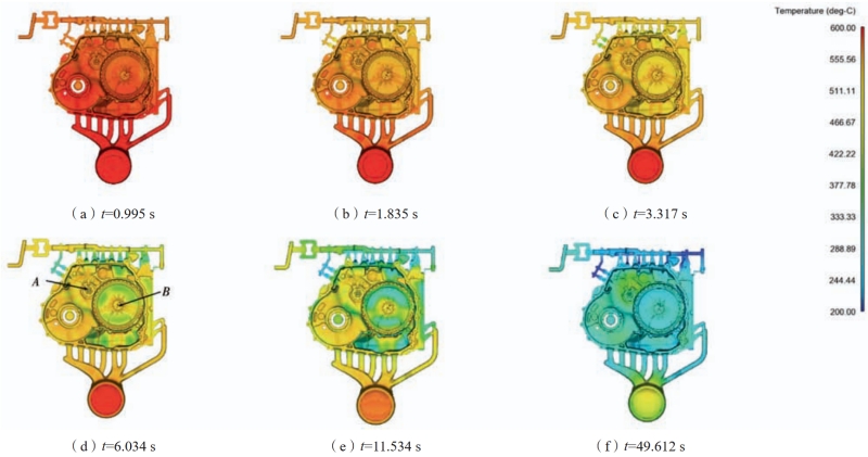 图5为真空压铸铝合金壳体的凝固过程。铸件的凝固趋势沿重力方向形成一定温度梯度,整体自排气管道而下向浇口部位凝固,基本符合顺序凝固的过程。在铸件凝固时间t=6.034 s时,如图5(d)所示,铸件左上部存在着凸起(A),该形状更易受较低的模具温度的影响较早开始冷却凝固,影响铸件整体凝固顺序,还可能会导致铸件其余部位在凝固时缺少金属液的补缩而出现缩松缩孔等缺陷。此外壳体底部的厚大区域(B)由于较大的壁厚,导致该区域冷却速度较慢,温度较高,此时周围合金已经开始凝固,这会导致该处的凝固收缩无法得到金属液补缩,形成了孤立液相区,产生热应力,出现缩松缩孔等缺陷,影响该区域的微观组织结构和力学性能。