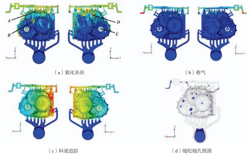 图6为缺陷分析。如图6(a)、(b)所示,在充型过程中,溢流槽A与C、凸起B以及孔洞C极易出现氧化夹杂缺陷,且存在一定的卷气风险。图6(c)显示了充型时不同浇口料液的流向,图6(d)为缩松和缩孔缺陷预测。综合图6所示的各项缺陷分析可以发现,易产生缺陷风险的位置多为不同股的料液交汇处,因此压射比压以及压射速度将会是影响最终成品质量的重要因素。